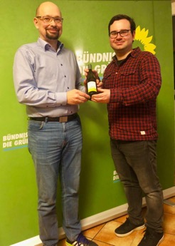Max Hemberger, Kreisvorsitzender, überreicht ein kleines Präsent an Thomas Burger von der Grünen Liste Plankstadt